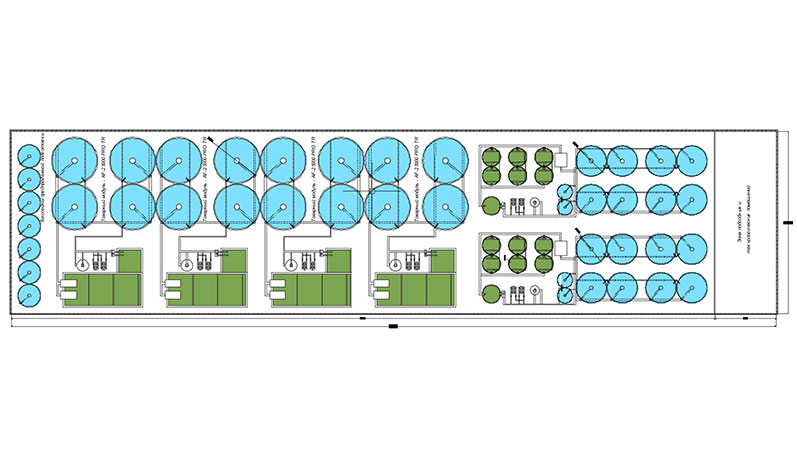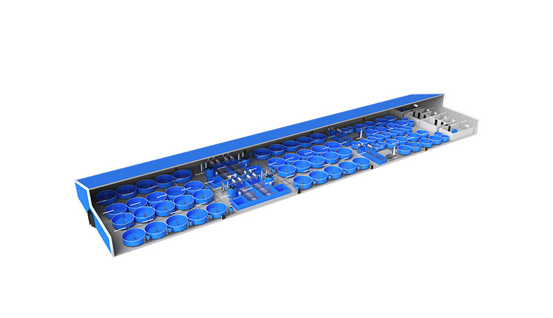 Комплексът се разполага в утопляеми помещения, хангарен тип с площ най-малко 2900 м2. Капацитетът на комплекса е 100 тона риба годишно. За зарибяване се използва посадъчен материал (10 грамови рибки) и екструдиран фураж от местни и чужди производители. Линията е автоматизирана, минималният производствен персонал – 1 човек, денонощно дежурство (в случай на висока степен на автоматизация на инсталацията, е възможно да се работи само на дневно дежурство). Търговска продукция – жива риба с тегло 1-2.6 кг. Периодът за достигане на проектния капацитет е 6 месеца след старта. В производствения план се използва потоков модел на зарибяване на всеки 6 месеца и равномерна реализация на рибата през цялата година.