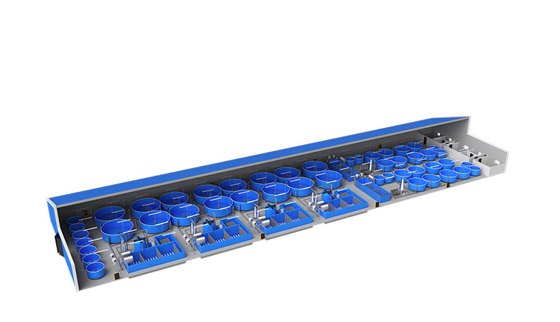 Комплексът се разполага в утопляеми помещения, хангарен тип с размер 23,5 Х 97 м (площ 2327 м2). Капацитетът на комплекса е 100 тона риба годишно. За зарибяване се използва посадъчен материал (15 грамови рибки) и екструдиран фураж от местни и чужди производители. Линията е автоматизирана, минималният производствен персонал – 1 човек, денонощно дежурство (в случай на висока степен на автоматизация на инсталацията, е възможно да се работи само на дневно дежурство). Търговска продукция – жива риба с тегло 1.3-2.5 кг. Периодът за достигане на проектния капацитет е 9 месеца след старта (в случей че първото зарибяване е с 15 гр. рибки) може да се постигне проектна мощност след 4 месеца( в случей че се направи първо зарибяване с 350 грамови рибки). В производствения план се използва потоков модел на зарибяване на всеки 4 месеца и равномерна реализация на рибата през цялата година.