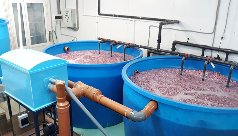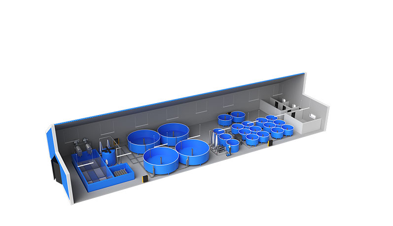 Комплексът се разполага в утопляеми помещения, хангарен тип с размер 14,5 Х 46 м (площ 667 м2). Капацитетът на комплекса е 25 тона риба годишно. За зарибяване се използва посадъчен материал (15 грамови рибки) и екструдиран фураж от местни и чужди производители. Линията е автоматизирана, минималният производствен персонал – 1 човек, денонощно дежурство (в случай на висока степен на автоматизация на инсталацията, е възможно да се работи само на дневно дежурство). Търговска продукция – жива риба с тегло 1.3-2.5 кг. Периодът за достигане на проектния капацитет е 9 месеца след старта (в случей че първото зарибяване е с 15 гр. рибки) може да се постигне проектна мощност след 4 месеца( в случей че се направи първо зарибяване с 350 грамови рибки). В производствения план се използва потоков модел на зарибяване на всеки 4 месеца и равномерна реализация на рибата през цялата година.