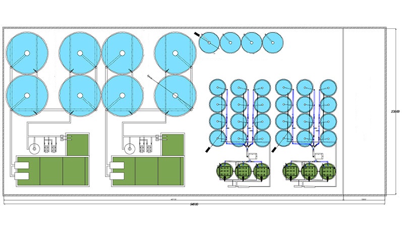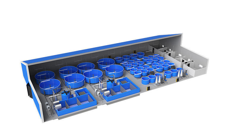 Комплексът се разполага в утопляеми помещения, хангарен тип с размер 23,5 Х 54 м (площ 1269 м2). Капацитетът на комплекса е 50 тона риба годишно. За зарибяване се използва посадъчен материал (15 грамови рибки) и екструдиран фураж от местни и чужди производители. Линията е автоматизирана, минималният производствен персонал – 1 човек, денонощно дежурство (в случай на висока степен на автоматизация на инсталацията, е възможно да се работи само на дневно дежурство). Търговска продукция – жива риба с тегло 1.3-2.5 кг. Периодът за достигане на проектния капацитет е 9 месеца след старта (в случей че първото зарибяване е с 15 гр. рибки) може да се постигне проектна мощност след 4 месеца( в случей че се направи първо зарибяване с 350 грамови рибки). В производствения план се използва потоков модел на зарибяване на всеки 4 месеца и равномерна реализация на рибата през цялата година.